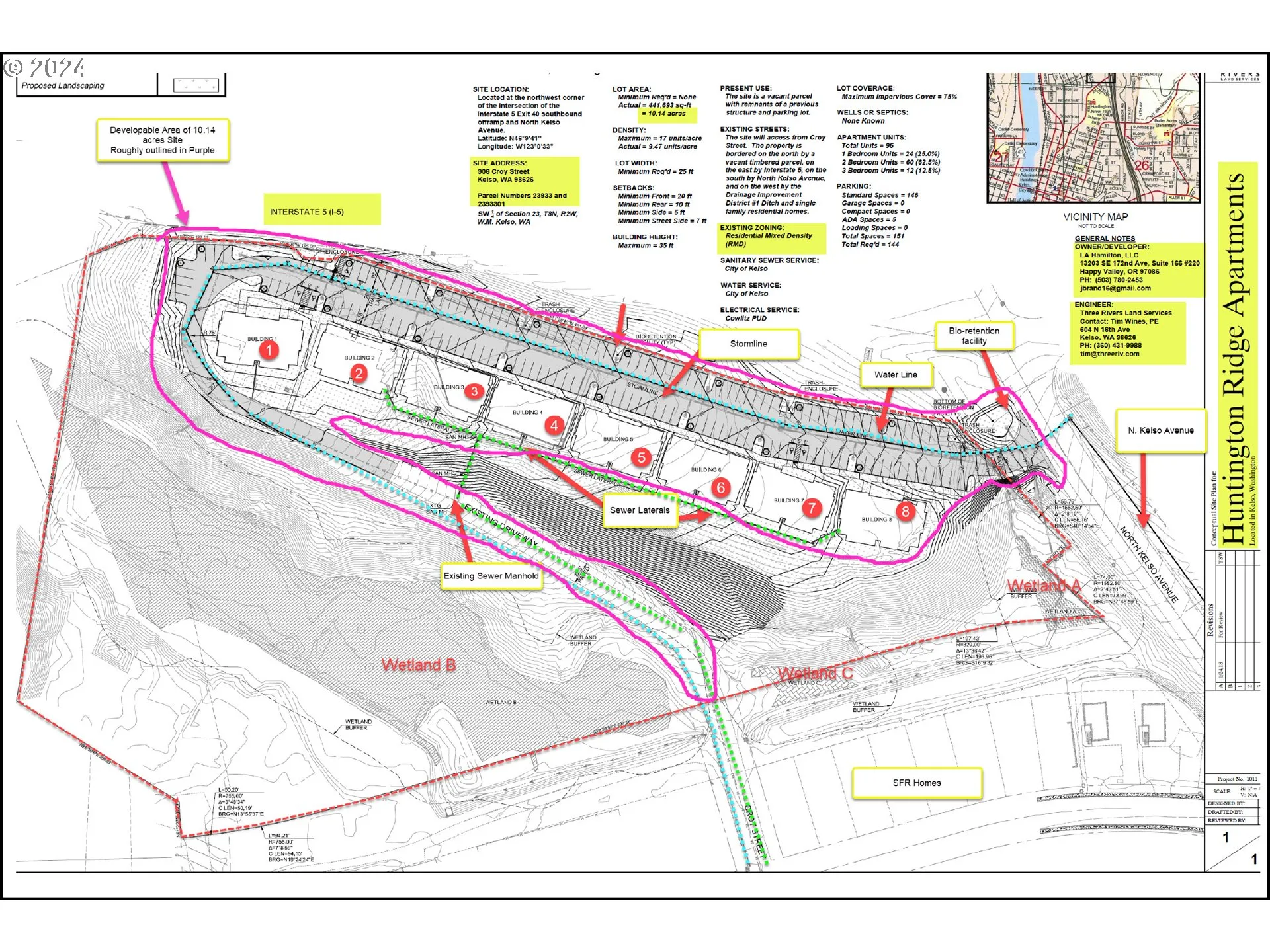 Prime Multi-family Development Opportunity – 10.13 Acres In Kelso, Wa. Zoned Rmd For Up To 17 Units/acre, With 5.5 Acres Usable (per Prior Appraisal). Preliminary Plans For 96 Apartment Units Across Eight 3-story Walk Up Buildings. Prime Exposure Along I-5 At N. Kelso Avenue, Offering Excellent Visibility And Space For 151 Parking Spots. Plans Include 48 One-bedroom (769 Sf) And 48 Two-bedroom Units (967 Sf), With An Average Unit Size Of 868 Sf. Key Studies Completed (some Updating Required): Title, Stormwater, Surveys, Critical Areas, Traffic, Geotech, Sepa, Giving You A Head Start On Obtaining Approvals With Less Risk And Cost Compared To Raw Land. No Impact Fees. Notable Considerations: Additional Survey Work May Be Needed To Confirm Access Options Per Early Wsdot Input. Ideal For Developers, Or Business’s Seeking Prime Freeway Exposure. Priced To Sell At $8,854 P/unit Of Approx. $155,000 P/developable Acre.