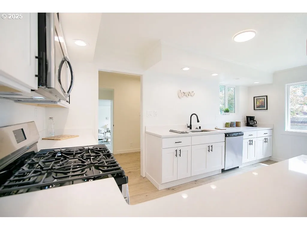 Warrenton — Tastefully Updated — 4 Bedroom / 2 Bath — 2385 Sqft — Living Room Plus Family Room W/ Fireplace — Kitchen W/ Stainless Appliances & Quartz Countertops — Gas Stove — Eating Bar — Dining Area — Bonus Room Upstairs — Primary Bedroom On Main — Bathroom W/ Soaker Tub — Forced Air — Vinyl Windows French Doors — New Roof — New Flooring — New Interior & Exterior Paint — New Fixtures — New Cabinets — Fenced (partially) — Large Patio — Yard — Garden Space — Trees — Minutes To Costco / Walmart / Fred Meyer — Close To Astoria & Seaside — Great Recreation Area — Turn Key & Ready To Go!