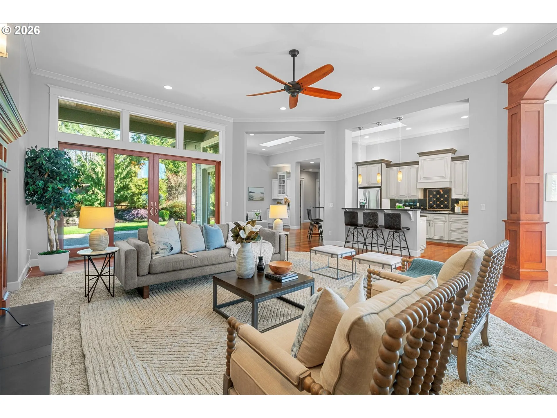 Nestled On A Beautifully Landscaped Lot In Coveted Garden Home. This Quality Custom Built Single Level Home Offers Refined Living With Exceptional Scale, Craftsmanship, And Privacy. A Dramatic Entry With Soaring 15-foot Ceilings And Rich Cherry Hardwood Floors Instantly Inspires A Sense Of Calm, And Elegance. Thoughtfully Designed For Both Relaxation And Comfort, The Living Room Is Anchored By A Custom Gas Fireplace With Built-ins And Framed By Expansive Windows That Invite In Natural Light And Serene Backyard Views. The Formal Dining Room, Highlighted By 12-foot Ceilings And Hardwood Floors, Provides A Sophisticated Setting For Intimate Dinners And Memorable Gatherings. The Kitchen Is Thoughtfully Appointed With Granite Countertops, An Eating Bar, Walk-in Pantry, And Beverage Refrigerator. A Discreet Built-in Desk Adds Versatility To The Kitchen Nook, While French Doors Open To The Patio For Seamless Indoor-outdoor Entertaining.the Primary Suite Is A Private Sanctuary, Offering Direct Access To The Backyard, A Walk-in Closet With Custom Storage, And A Spa-inspired Bath Featuring Heated Tile Floors, Double Vanities, And A Deep Soaking Tub. An Adjoining Laundry Room With Sink And Built Ins Enhances Everyday Convenience Without Sacrificing Design.two Additional Bedrooms Share A Jack-and-jill Bath, Ideal For Guests Or Family, While A Generously Sized Office Or Den Features Hardwood Floors, Elegant Wainscoting, And Impressive Double 8-foot Knotty Alder Doors.the Fully Fenced Backyard Is Designed For Effortless Entertaining And Relaxation, With A Partially Covered Patio, Exterior Gas Hookup, And Raised Garden Beds, All Surrounded By Mature Landscaping. Additional Amenities Include A Three-car Garage With Easy Access Upper-level Storage, Tankless Gas Water Heater, Front Entry Sun Shade, Four-zone Sprinkler System, And Professionally Maintained Grounds.